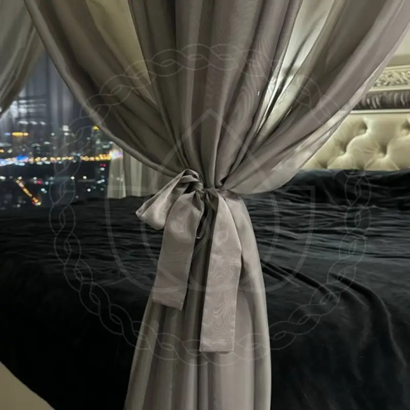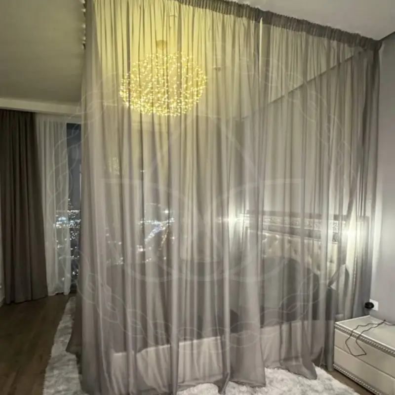 Пошивом балдахина занимались мастера нашего пошивочного цеха. Он изготовлен из стопроцентного полиэстера. Ткань — микровуаль. Размеры балдахина составляют 220х230 сантиметров. Под навеску специалистами по монтажу был установлен профильный карниз в эркерном исполнении с потолочной системой креплений.