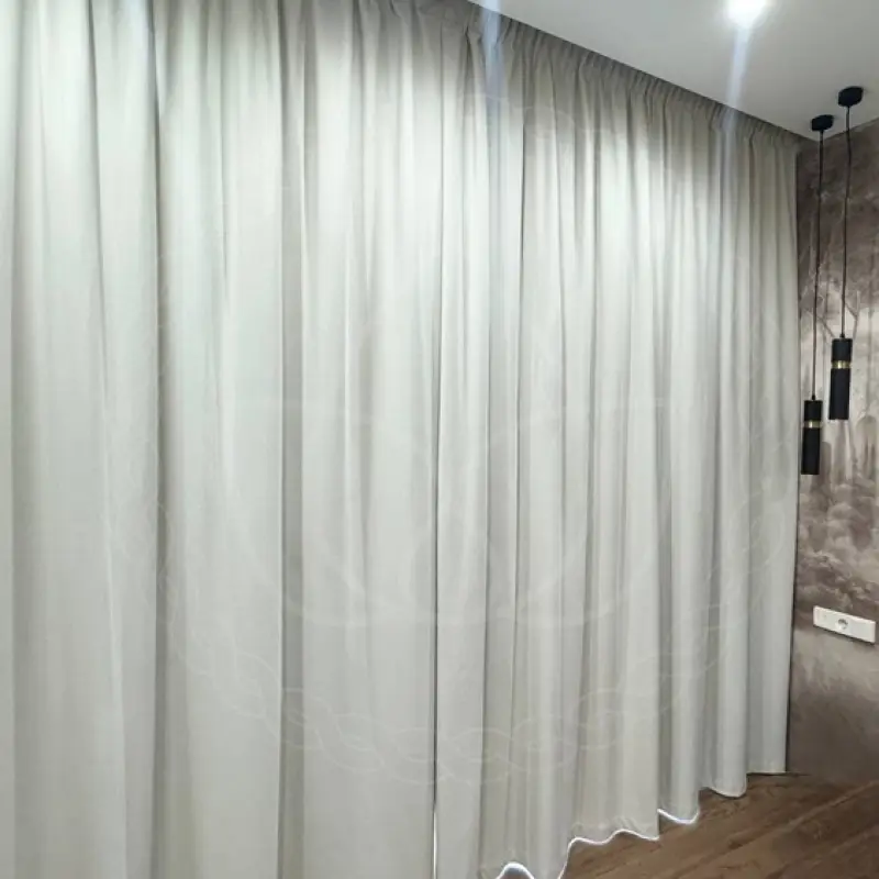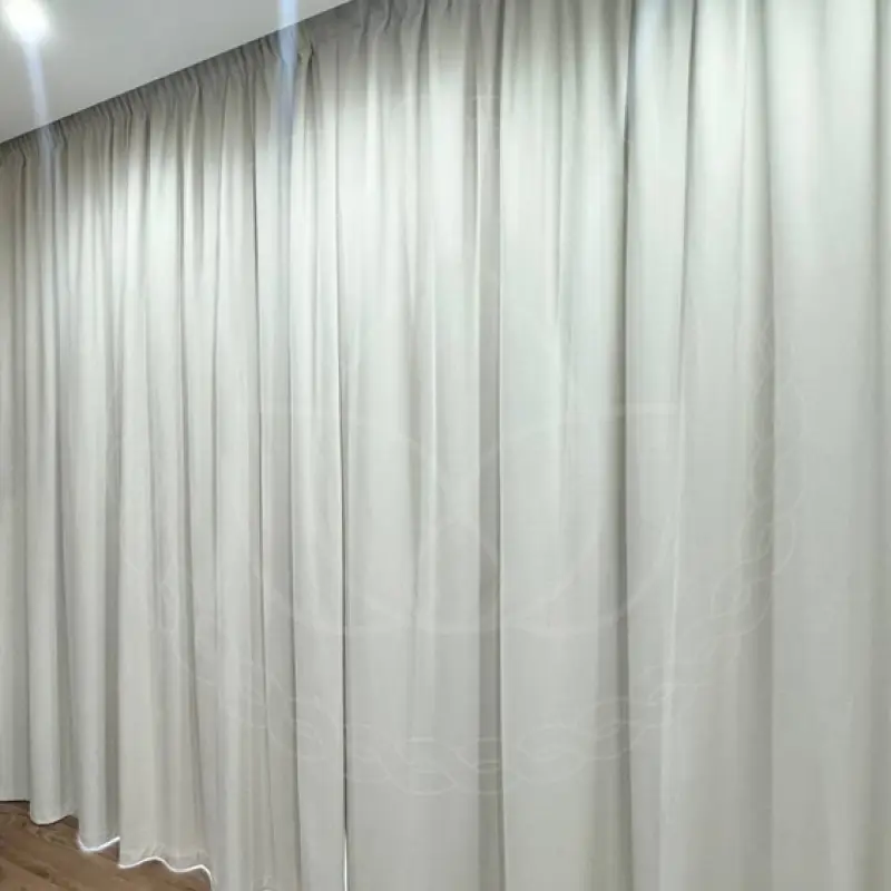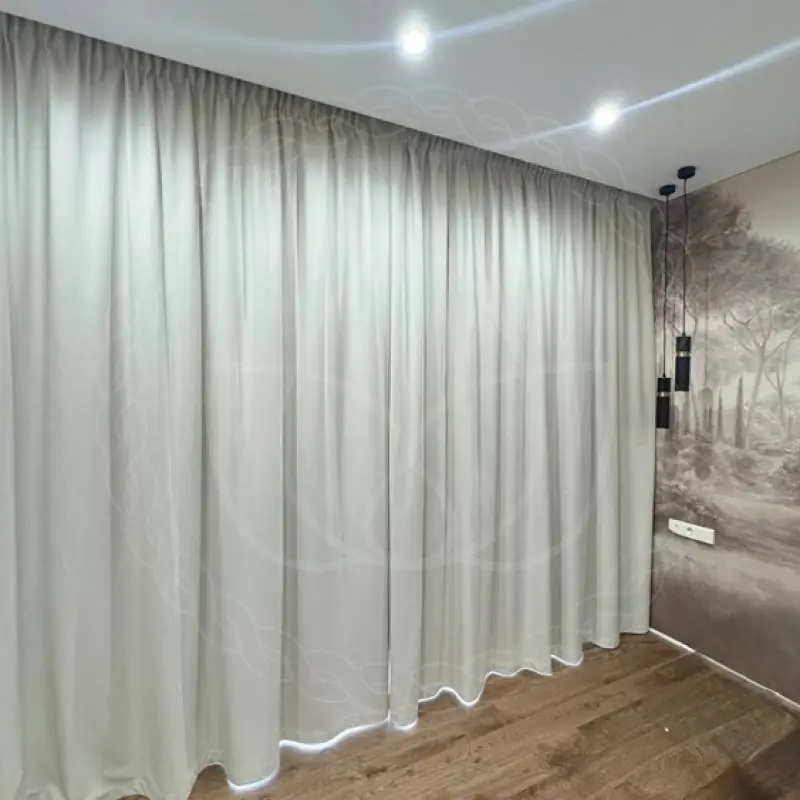 Портьеры были изготовлены мастерами нашего пошивочного цеха. Их размеры составили 350х280 сантиметров. Под навеску был установлен профильный потолочный карниз из алюминиевого сплава.