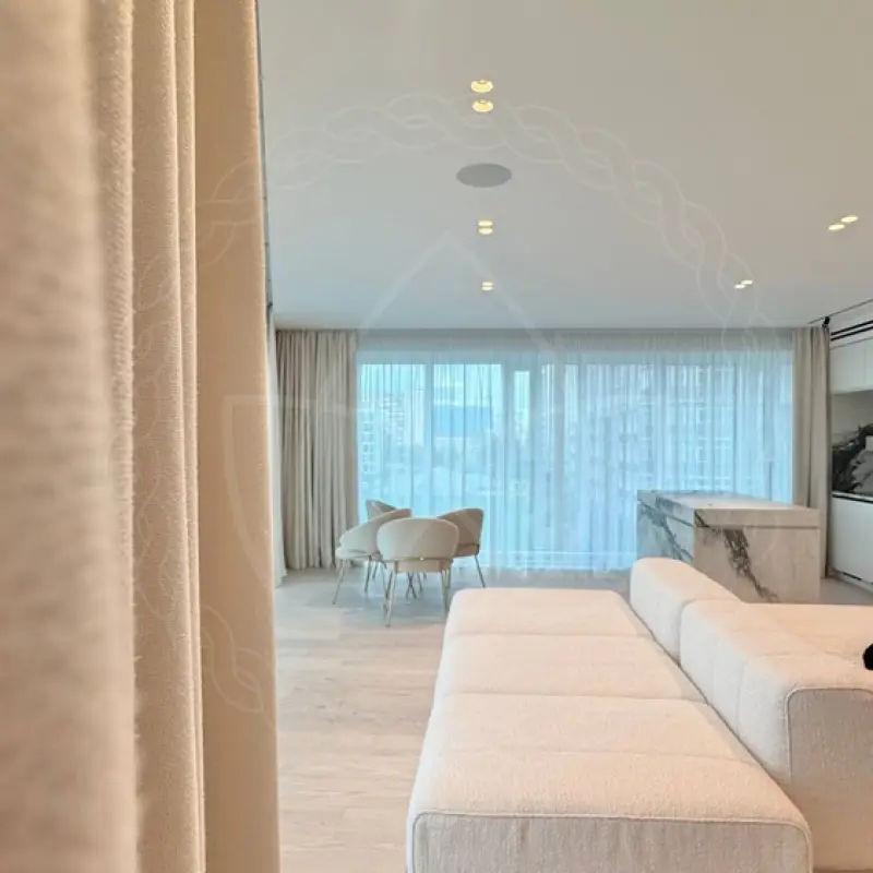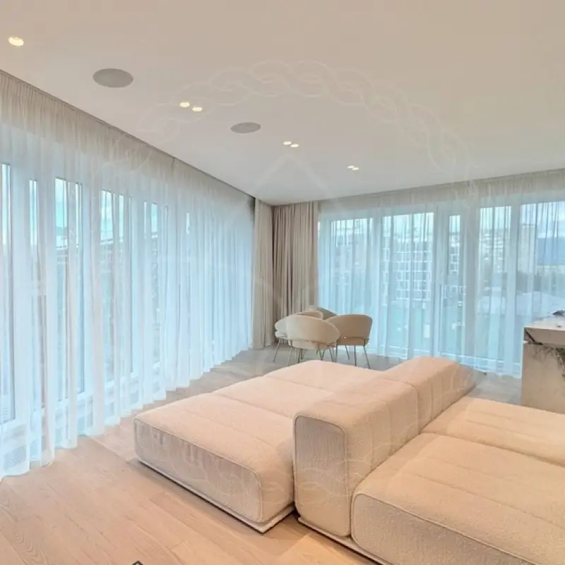 При пошиве были использованы ткани с полиэстером в составе (100%) Ширина штор составила 6 метров, длина — 2.8 Для навески на потолочную зону был установлен карниз с электрическим приводом модели Somfy Irismo WireFree с различными вариантами управления (кнопка, пульт или приложение)