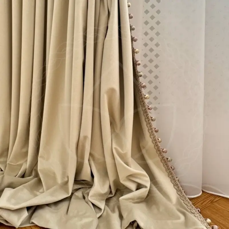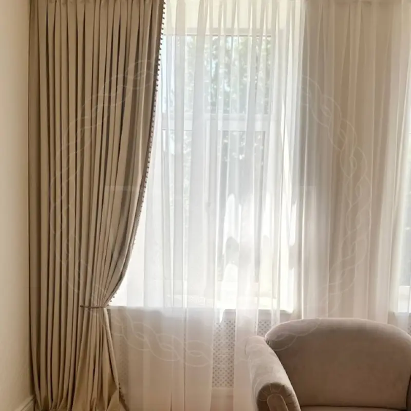 Шторы изготовили из однотонной ткани теплого бежевого и белого цветов. Чтобы они выглядели более оригинально и эффектно, на внутренний край нашили элегантную тесьму с помпонами в тон основному материалу. Также предложили хозяевам подобрать под навеску длинный карниз и стильные металлические подхваты, чтоб вся стена была задрапированной. Эта простая комбинация помогает зрительно увеличить пространство комнаты, сохранить максимум освещения в ней в дневное время и менять варианты драпировки по своему желанию.