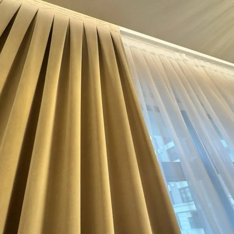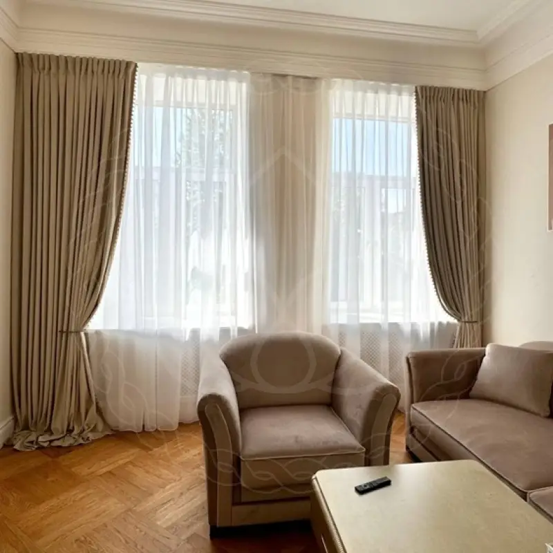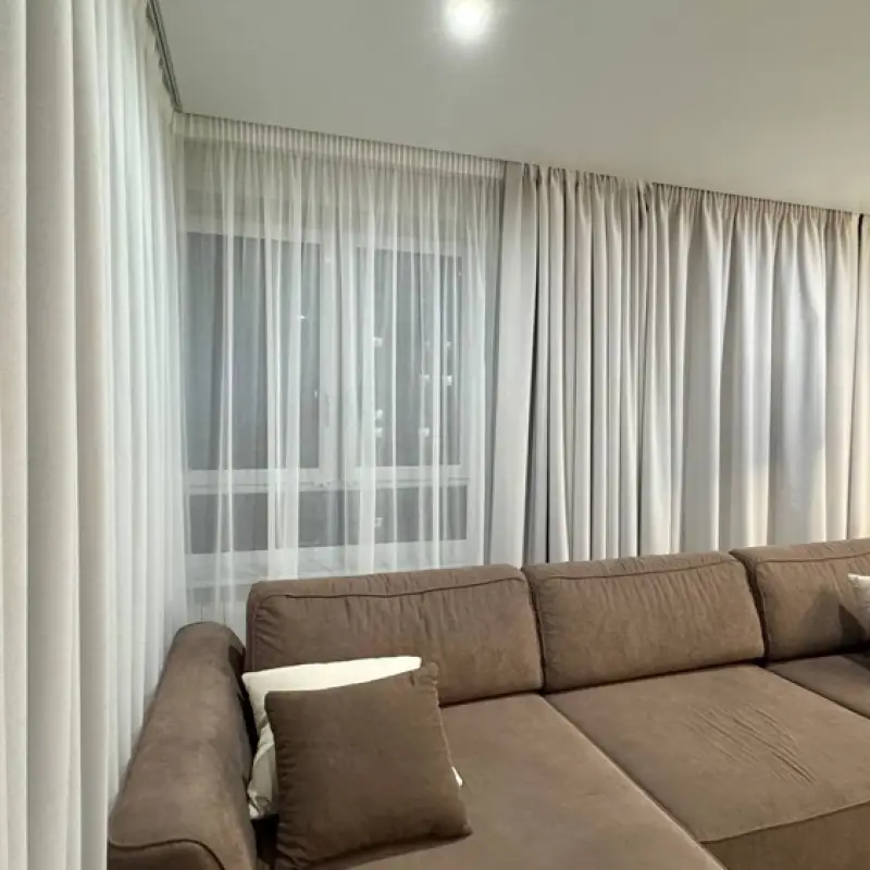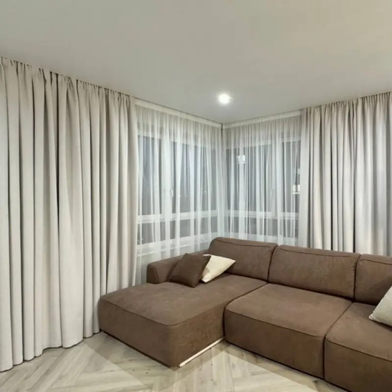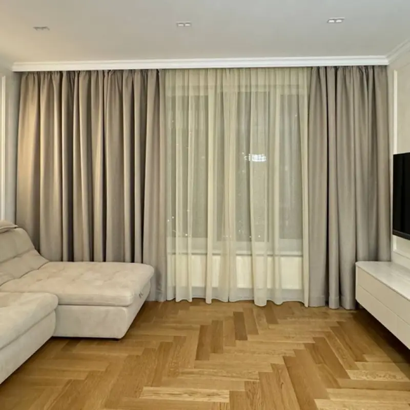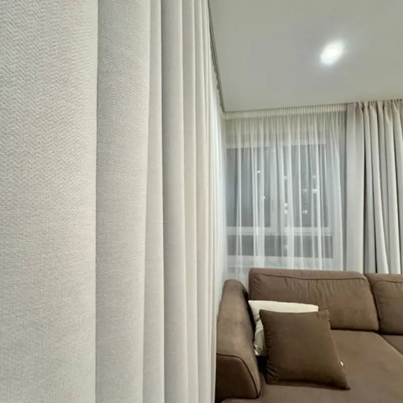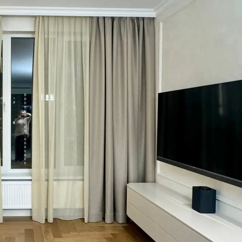 При пошиве использовали шенилл и вуаль из полиэстера (100%) Материалы хорошо переносят воздействие солнечных лучей, не накапливают частички пыли и довольно просты в уходе. Шторы длиной 320 и шириной 370 сантиметров навесили на карнизный профиль из алюминия со стеновым креплением.