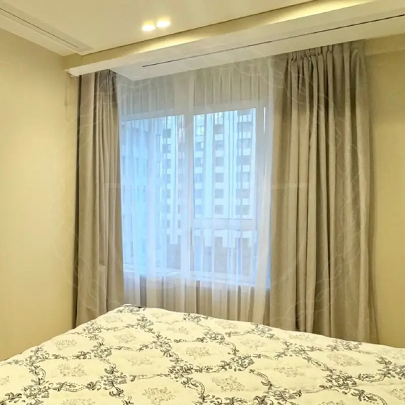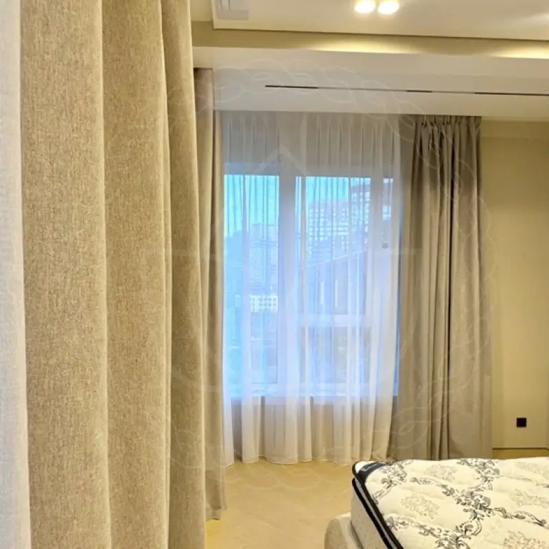Пошив производился из синтетических тканей (100% высококачественного полиэстера) Под навеску штор размером 280х280 сантиметров установили профильные карнизы стенового типа крепления. Для создания эффекта расширения пространства их вынесли за пределы оконной зоны.