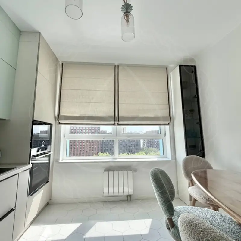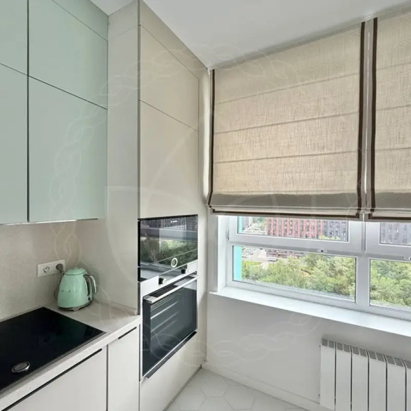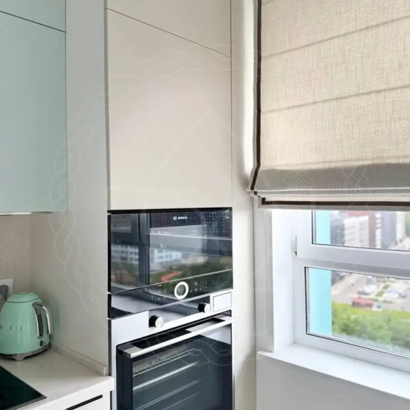 Для большого окошка на современной кухне, оформленной в довольно минималистичном стиле, мы предложили римские шторы. Это один из самых популярных вариантов декора для кухонь в городских квартирах, где чаще всего в приоритет ставится практичность, а не эстетика.
