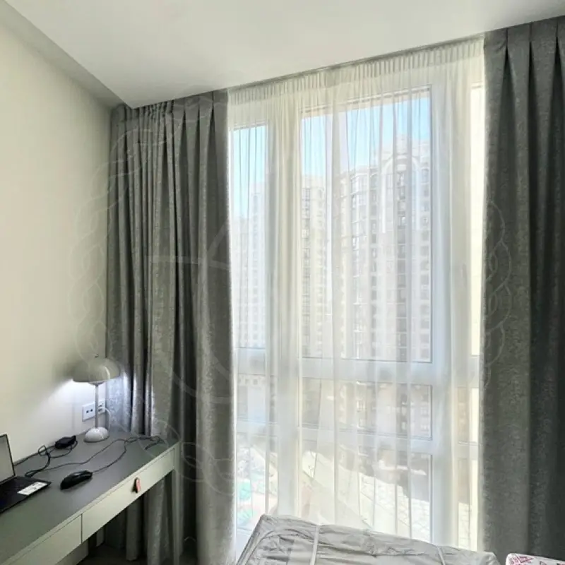 Для маленькой спальни с панорамным окном во всю стену мы предложили вариант с традиционным сочетанием из тюля и портьер. Поскольку интерьер довольно лаконичный, материал для них подобрали с выразительной фактурой — жаккард с тканым узором и сетчатый тюль.