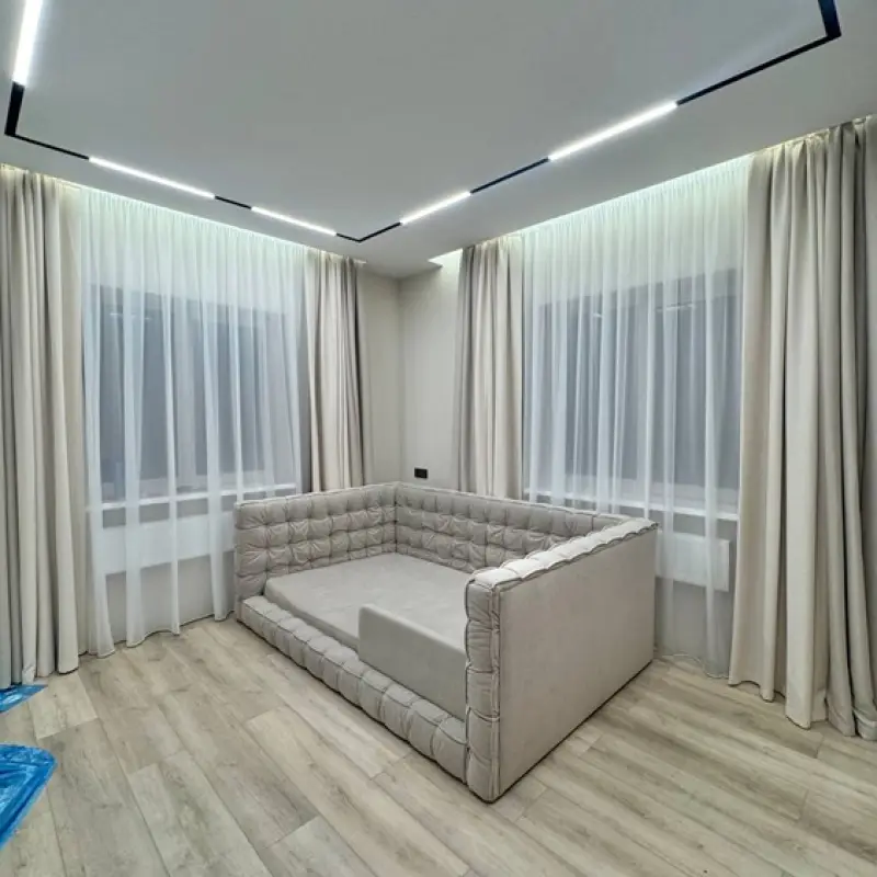 Портьеры сшиты в виде единого полотна и имеют размеры 2,9х2,6 метра. Высококачественный полиэстер в составе гарантирует износостойкость материала. Навеска проводилась на прямой профильный карниз модели СТ с настенным типом крепления.