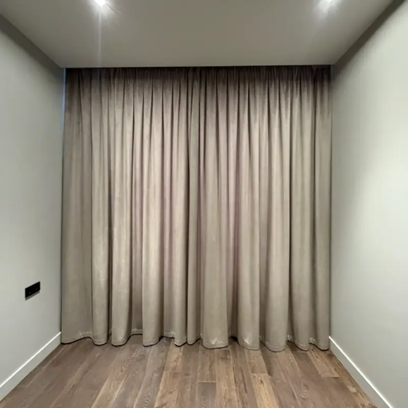 Портьеры имеют размеры 3х2,8 метра и пошиты из 100% хлопка, а тюль из полиэстера. Для удобства крепления и драпировки к ним была добавлена шторная лента. Крепеж производился на декоративный металлический карниз круглой формы в серебристом цвете.