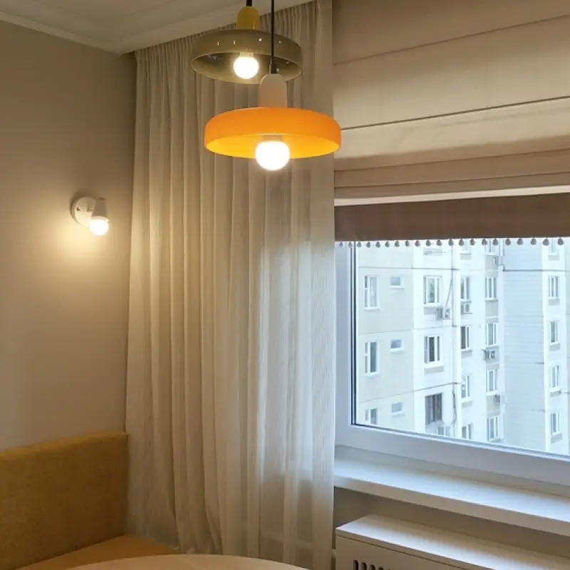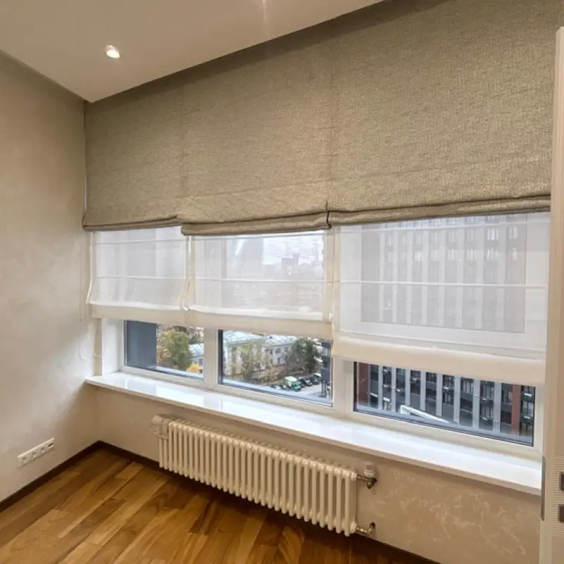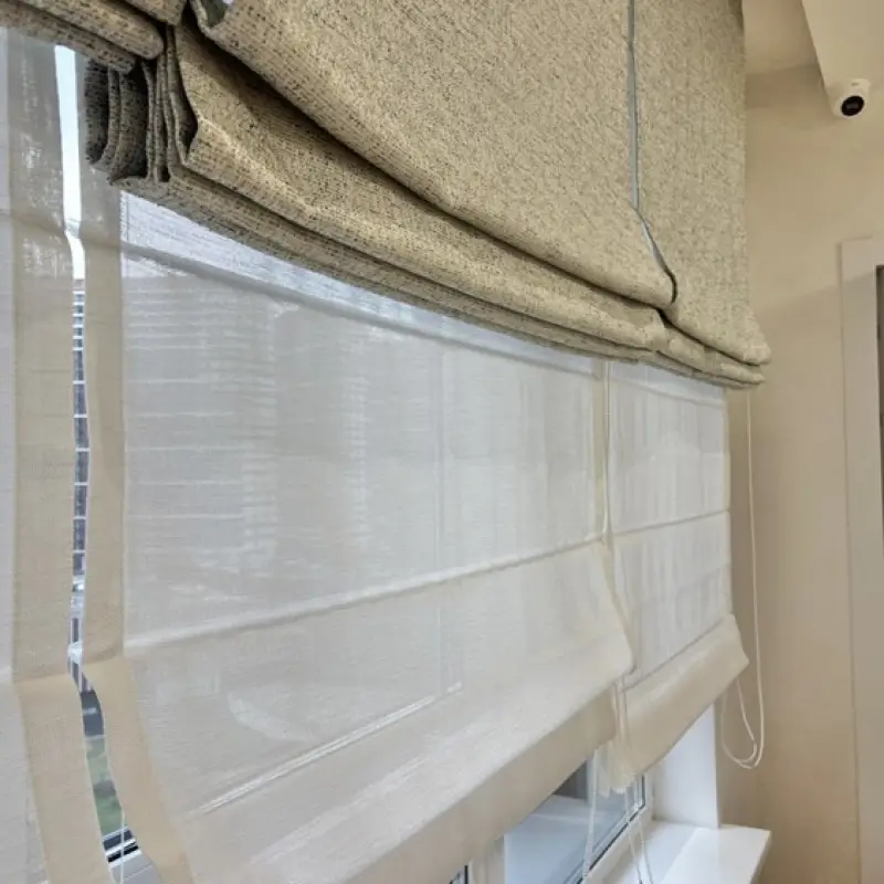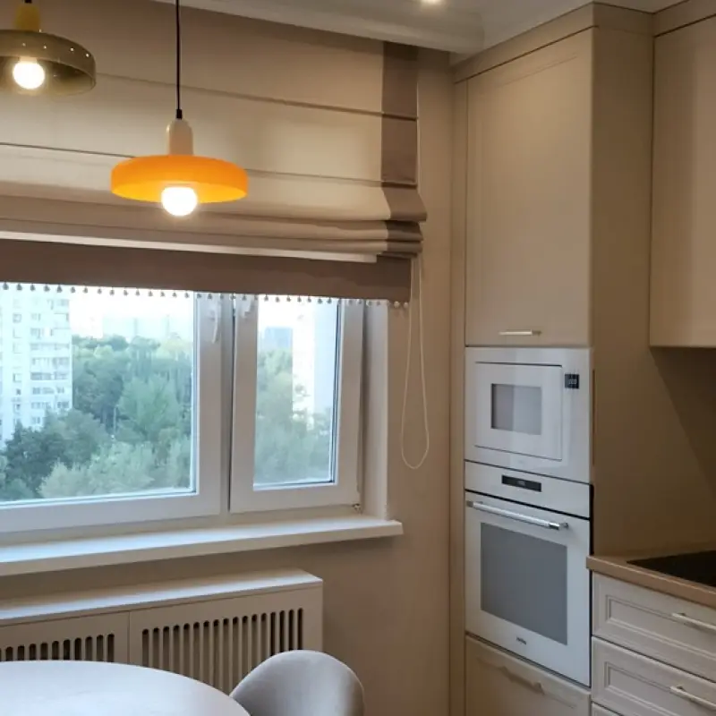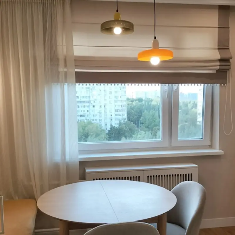 Одним из помещений, которые мы декорировали по этому заказу, стала кухня-гостиная. За счет объединения двух комнат она довольно просторная, поэтому одно из окон мы предложили оформить портьерами с тюлем, а второе римской шторкой. Такое разделение сделали, поскольку одно из окошек выходит на участок с садом, и хозяевам нравится любоваться открывающимся видом во время отдыха и приема пищи. С римской шторой осуществить это очень просто, так как она не мешает обзору и к тому же легко поднимается и опускается при необходимости.