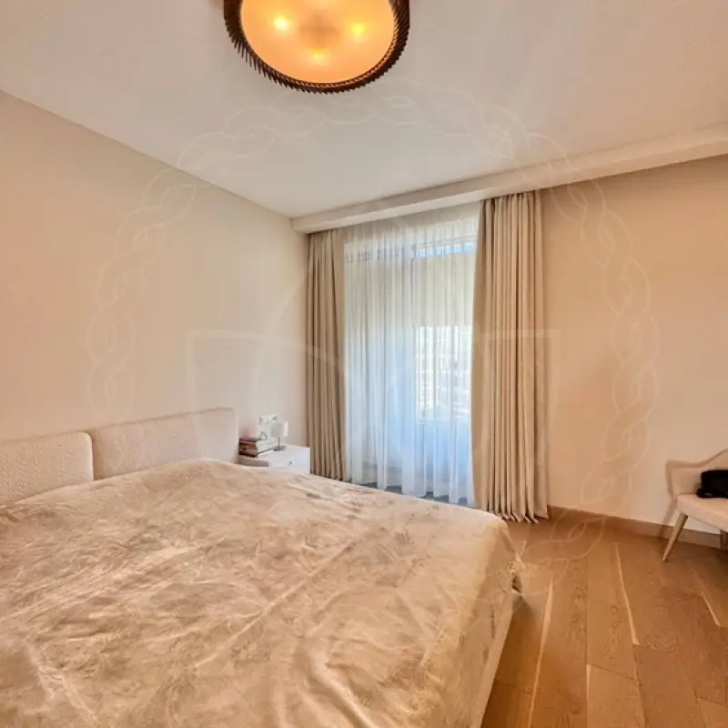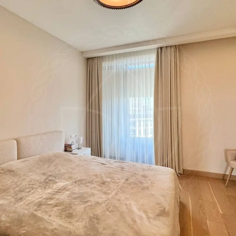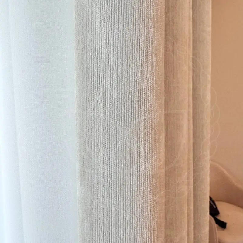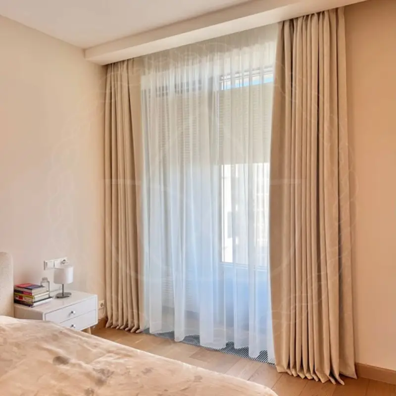 Для формирования комфортной среды для сна и отдыха портьеры пошили из вельвета со светонепроницаемым димаутом. Он блокирует до 80% света. На пошив тюлевой шторы пошла нежная матовая вуаль. Оба вида тканей имеют в составе стопроцентный полиэстер. Длина шторных полотен составила 280 сантиметров, ширина — 270. Монтаж потолочного профильного карниза из алюминия и навеску с отпариванием производил мастер нашей студии текстильного декора.