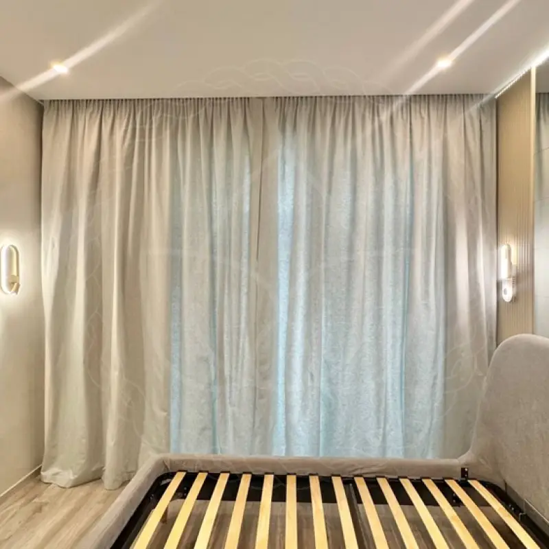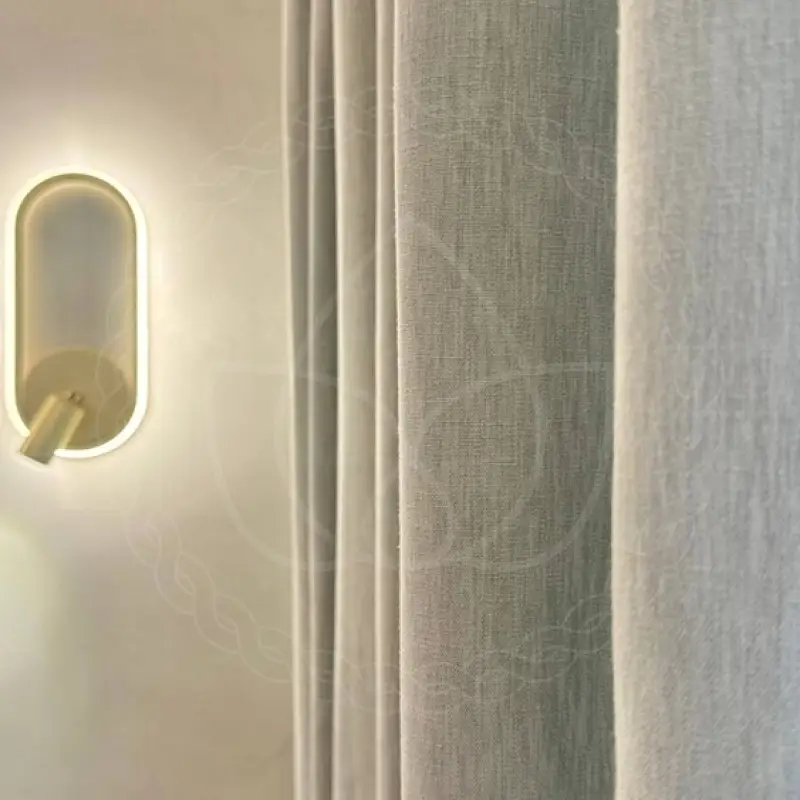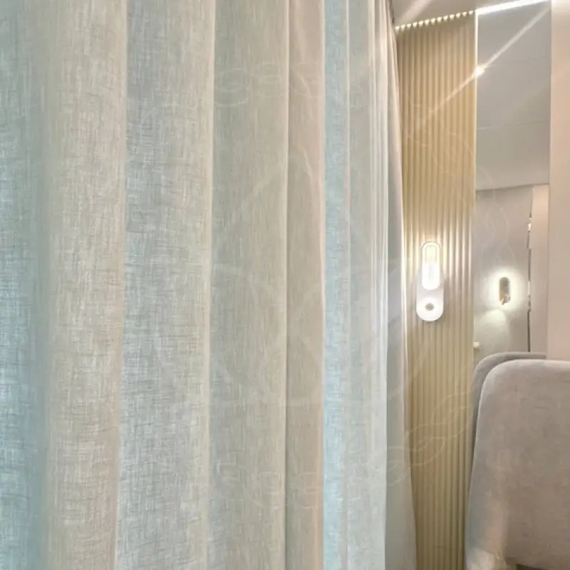 Для пошива гардин размерами 350х290 сантиметров мы использовали полиэстеровые материалы (100%) из коллекции стандартных тканей. Все полотнища навесили на профильный карниз из линейки DS с потолочным креплением. Навеску и монтаж осуществляли специалисты нашего салона текстильного декора.