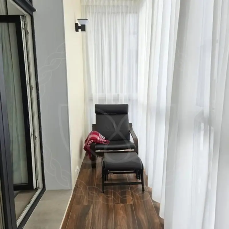 Чтобы не слишком затемнять помещение, но при этом сохранить приватность и обзор, оформить балкон решили с помощью полупрозрачных шторок из тюля. Ткань выбрали классического белого цвета. Она нейтральна и при этом эффектно контрастирует с шоколадным полом и мягко оттеняет бежевые стены и современные бра на них.