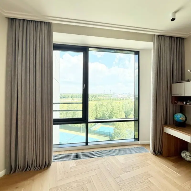 Сдержанный серый цвет портьерной ткани очень хорошо вписывается в стилистику детской, служит приятным глазу контрастным элементом в обстановке комнаты, а благодаря креплению на скрытом алюминиевом карнизе, визуально объединяет между собой потолок, окно и рабочую зону со столом.