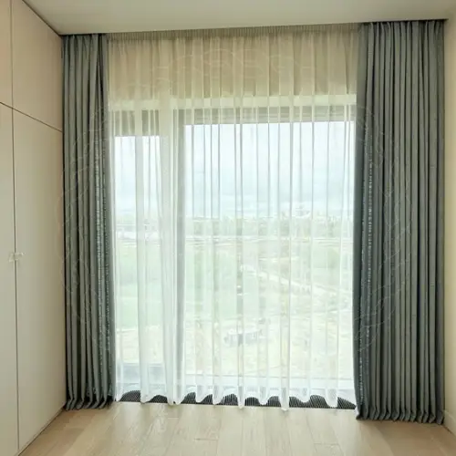 Над изготовлением портьер в данном проекте работали сотрудники нашего пошивочного цеха. При пошиве они использовали ткани из высококачественного стопроцентного полиэстера, обладающие хорошей устойчивостью к выцветанию и растяжению волокон. Размеры изделий по ширине и длине составили 2.8х2.7 метра. Для навески был установлен двухрядный карниз из серии карнизных профилей DS с потолочной системой креплений.