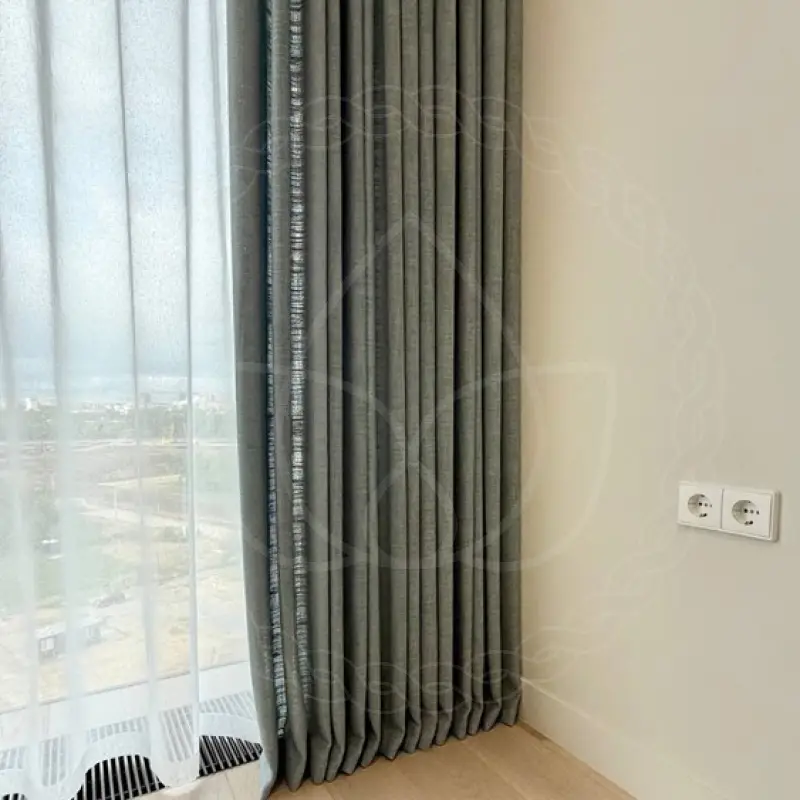 - Тип Портьеры из рогожки и тюль на равномерной сборке верха