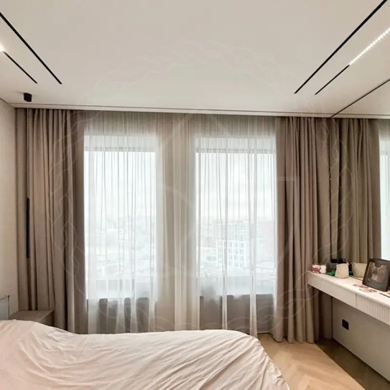 Для пошива использовали ткани из полиэстера стандартной категории качества. Размеры штор по ширине — 3 метра, по длине — 2.7 Потолочный карнизный профиль установил наш мастер по монтажу. Навеска и отпаривание готовых изделий сделаны дизайнером.