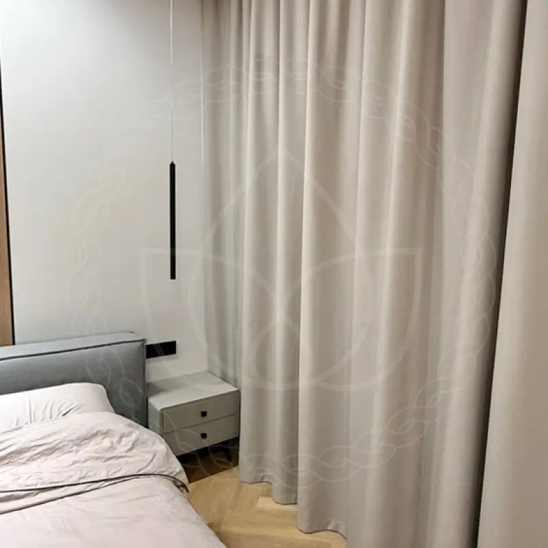 Поскольку речь о спальной комнате, хозяевам предложили портьеры из димаута. Он хорошо блокирует свет (до 80%), обеспечивая спокойный здоровый сон и полную приватность.