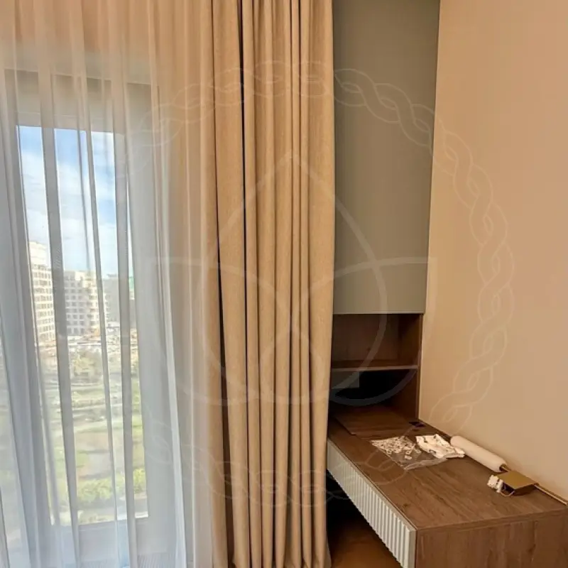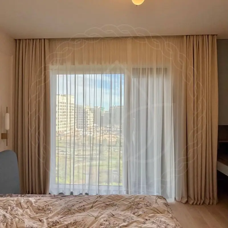 На пошив портьер размером 350х280 сантиметров пошли ткани из стопроцентного полиэстера высокого качества — рогожка средней плотности и вуаль. Профильный алюминиевый карниз из линейки DS с потолочным креплением устанавливал в карнизный “карман” мастер по монтажу из нашего салона.