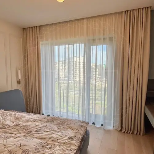 Песочные портьеры с небольшим напуском и белый тюль собрали на равномерную складку. За счет этого драпировка выглядит стильной и аккуратной, и атмосфера в комнате кажется более уютной и располагающей к отдыху.