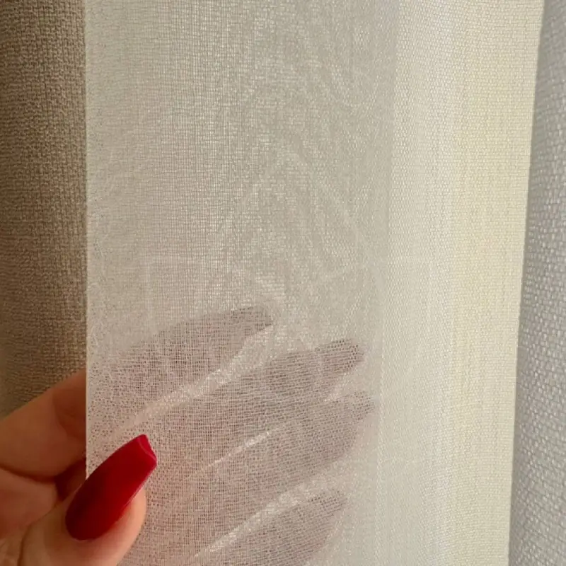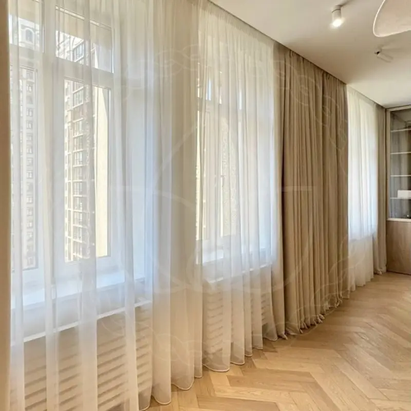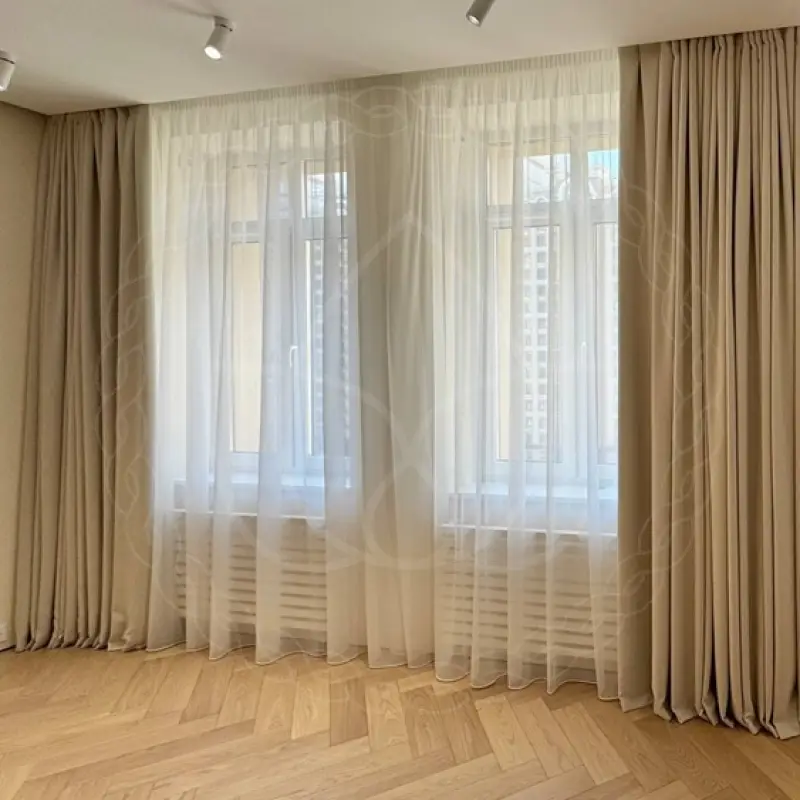 Для шитья использовали ткани из стопроцентного полиэстера — рогожку с ворсом и тюль “под лен”. Готовые портьеры имеют размер 4.5х2.9 метра и навешены на потолочный карнизный профиль с двумя рядами.