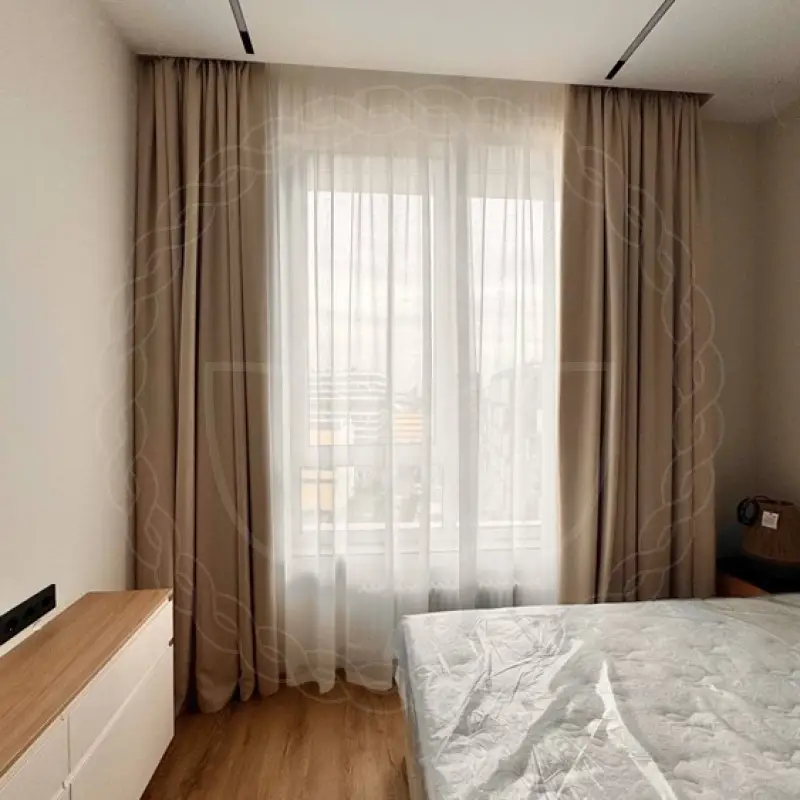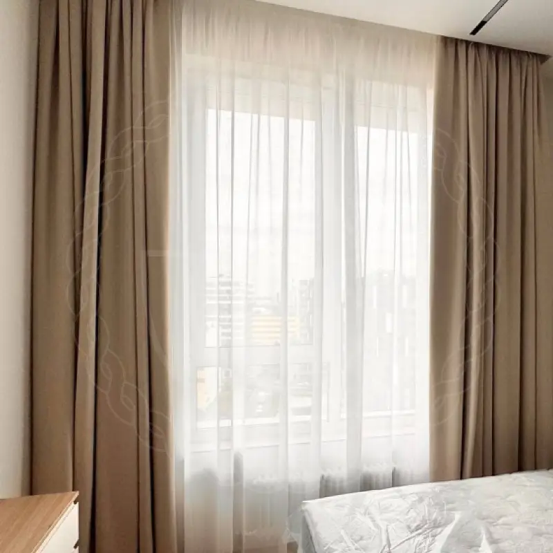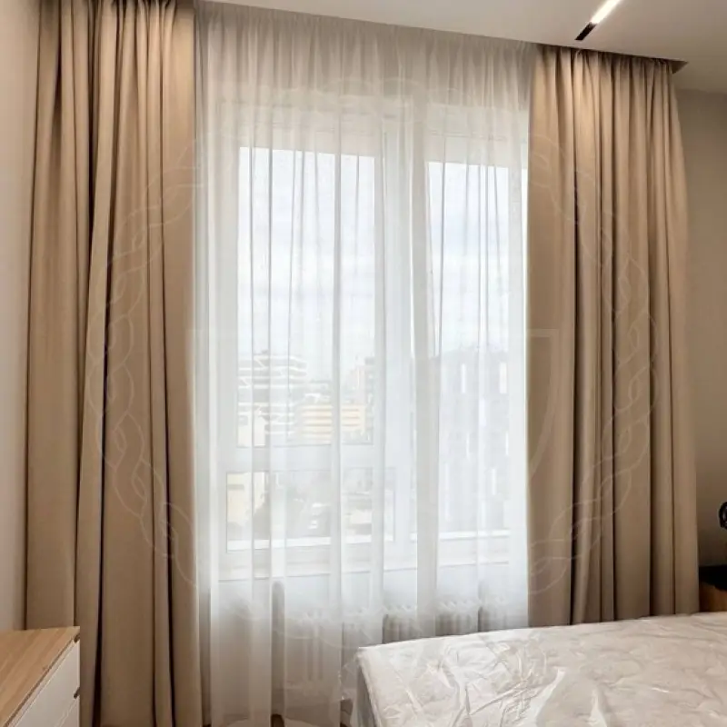 Для пошива декоратором были отобраны ткани из стопроцентного полиэстера высокого качества. Это димаут, гарантирующий затемнение для комфортного засыпания, и вуаль, которая мягко рассеивает солнечный свет и дает приватность в дневное время. Шторы длиной 280 сантиметров и шириной 270 были навешены на прочный карниз из алюминиевого профиля с потолочным способом крепления.