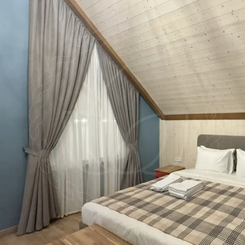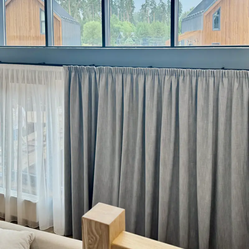 - Тип Портьеры и тюль с равномерной сборкой верха на наклонное окно