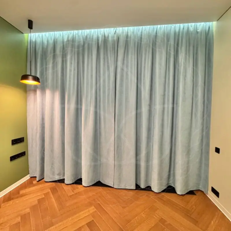 Размер портьер по ширине — 320 сантиметров, по длине — 270 Навеска была произведена на крючки на двухрядном потолочном карнизе из алюминиевого профиля.