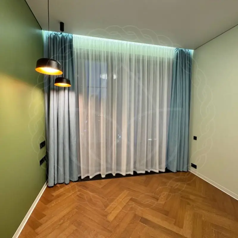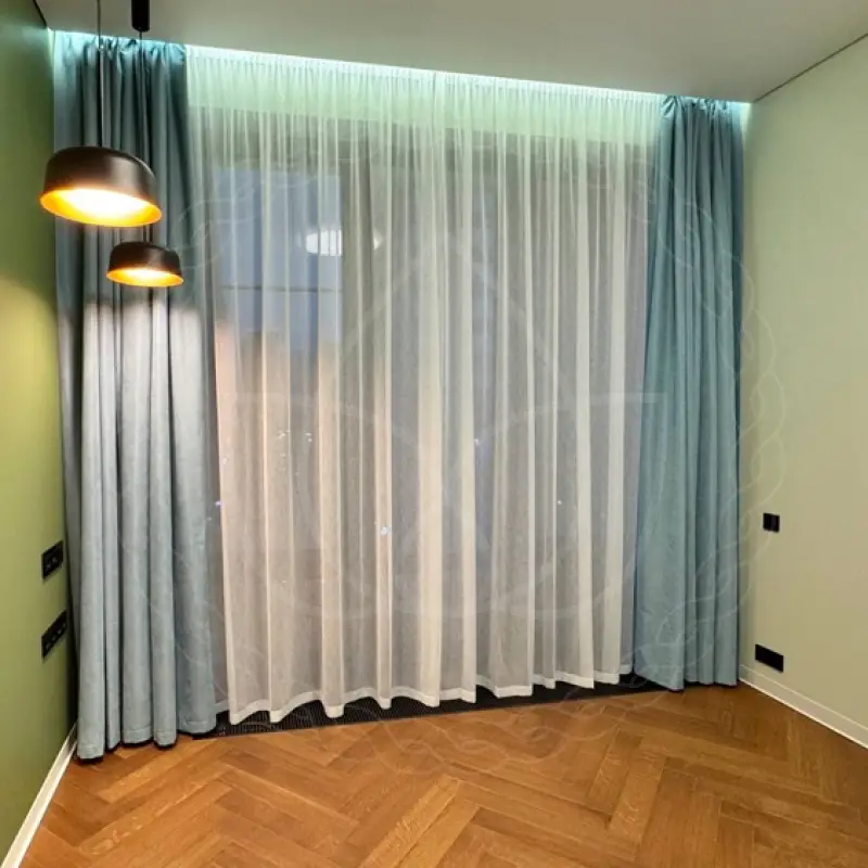 Пошив был выполнен в нашем пошивочном цехе. Для изготовления подобрали ткани из полиэстера стандартной категории. Димаут позволяет затемнить комнату и добавить приватности, а тюлевая материя эффективно рассеивает солнечный свет, снижая его агрессивное влияние на глаза.