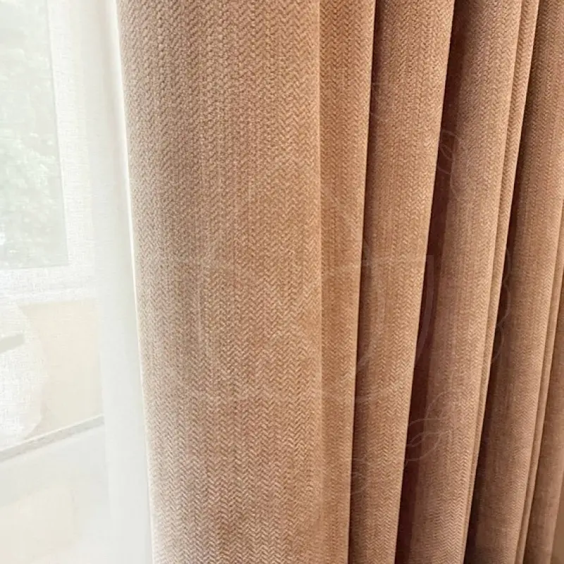 Портьеры теплого оттенка кофе с молоком немного темнее однотонных бежевых стен и имеют тканый узор “елочка”. Благодаря этому, шторные полотна мягко выделяются на их фоне, деликатно обрисовывая контуры оконного пространства, а также оттеняя люстру с плафонами кофейного цвета. Так как мебель тоже выдержана в коричневой цветовой гамме, новые занавески прекрасно дополняют ее, поддерживая гармонию в интерьере зала.