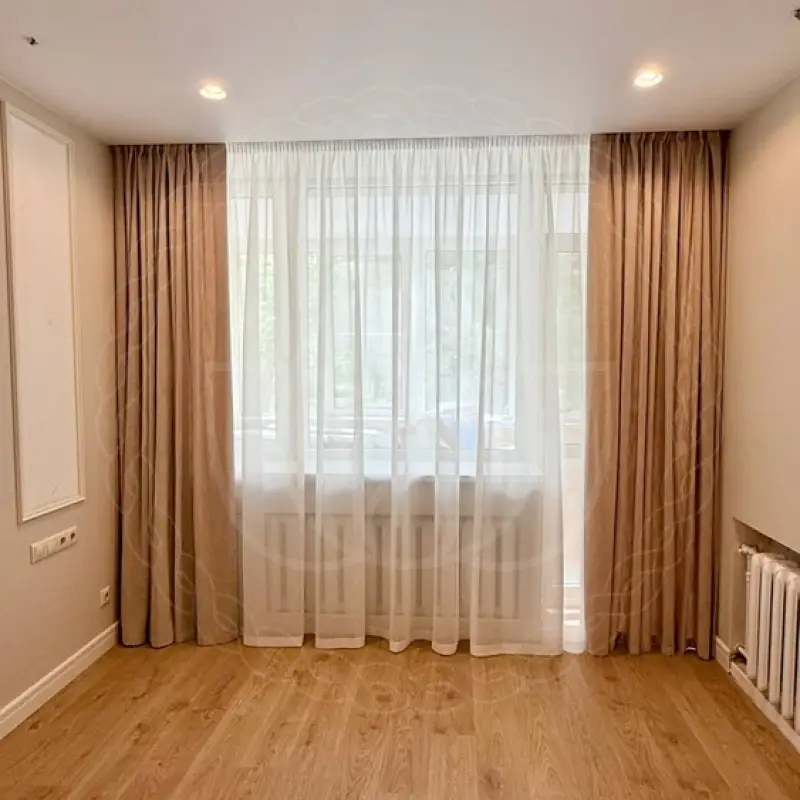 Для пошива были выбраны ткани из 100% полиэстера — жаккард и вуаль. По ширине и длине размеры готовых штор составили 300х270 сантиметров. Двухрядный профильный карниз для них установили в нишу на потолок.