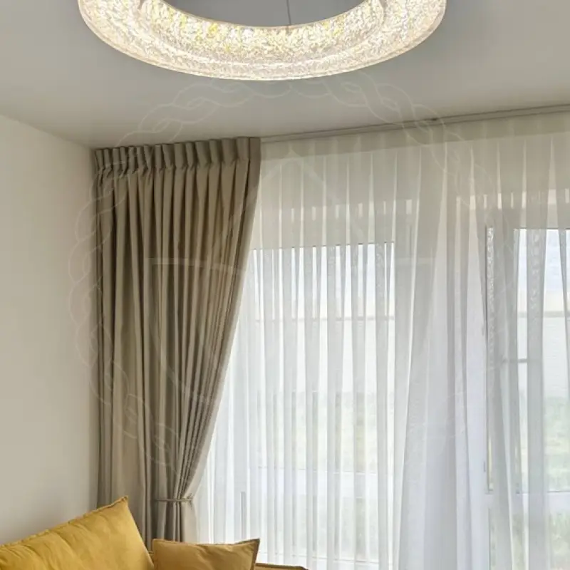 Оформить требовалось окошко в просторной современной гостиной. Акценты в интерьере здесь уже расставлены. В качестве них выступают лимонно-желтый диван и большая круглая люстра. Чтобы не нарушать существующую гармонию, занавески было предложено изготовить из текстиля менее броских расцветок. Для этого выбрали материал приятного прохладного оттенка “мускатный орех” В пару плотным шторным полотнам добавили белоснежный тюль.