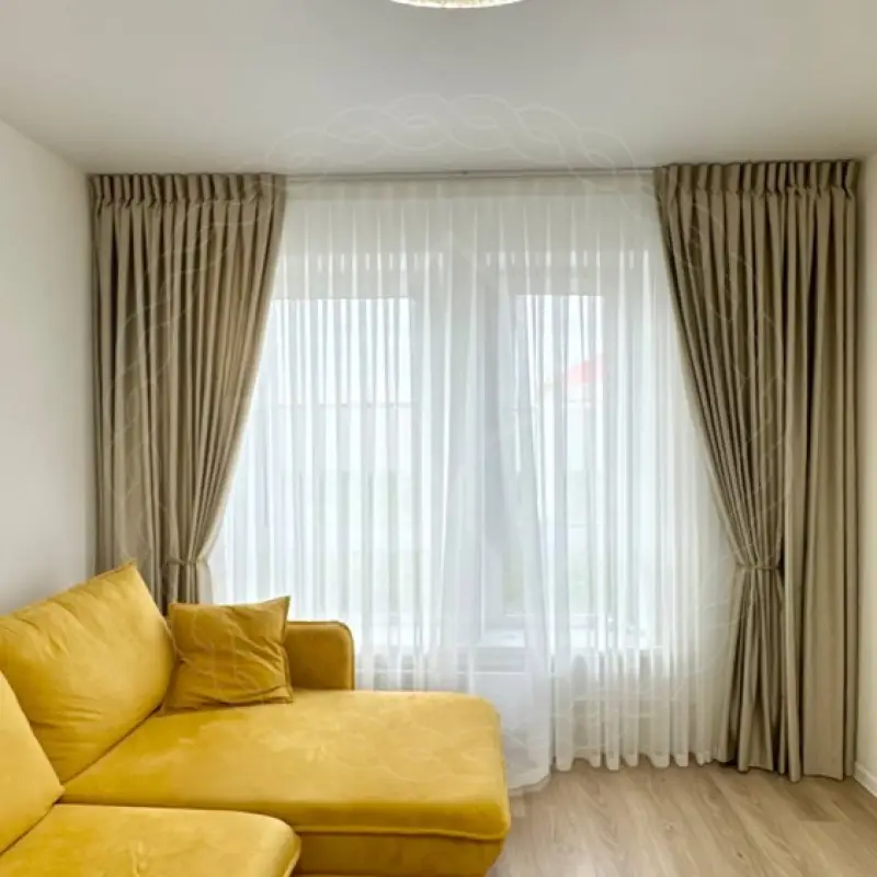 Пошив производился в нашем цехе из полиэстеровых тканей категории “премиум” (сатин, вуаль) Размеры готовых штор по длине составили 280 сантиметров, по ширине — 290. Под навеску использовали профильный потолочный карниз с двумя рядами.