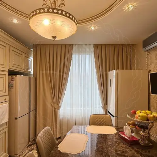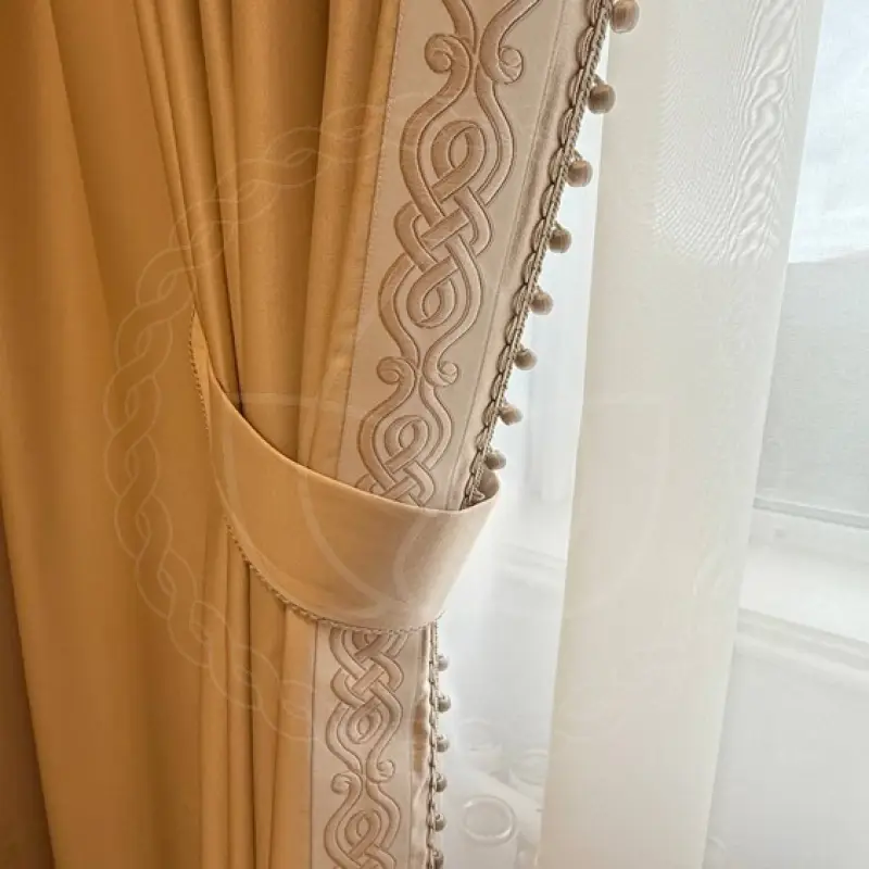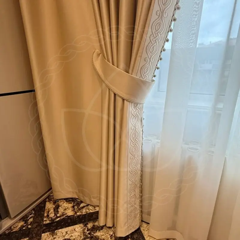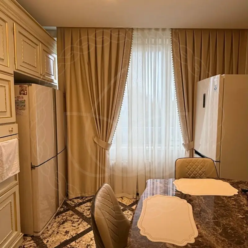 Для большого окна в просторной кухне мы предложили портьеры и тюль. Они чудесно подошли к интерьеру с элементами классического стиля. Чтобы новые шторные полотна максимально органично включились в обстановку, по внутреннему краю мы нашили широкий декоративный кант с изящным орнаментом и тесьмой. Они оживляют однотонные занавеси из плотного блестящего сатина в золотисто-бежевых тонах, помогают выделить оконное пространство на общем фоне. Оттенок хорошо дополняет кремово-белую мебель и стены.