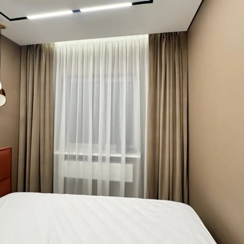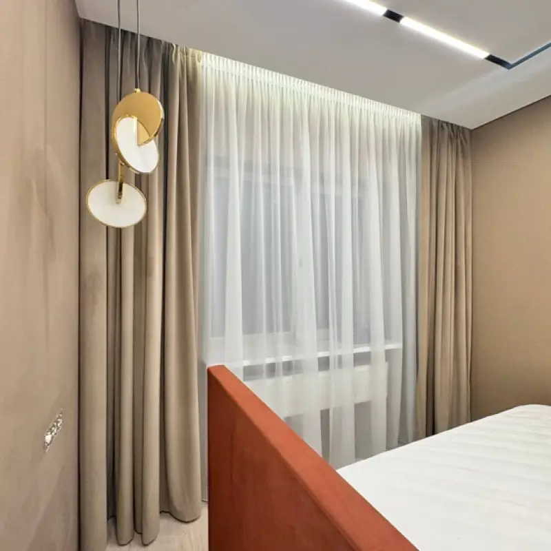 Рогожка — материал среднеплотный. Шторы из таких тканей хорошо защищают комнату от внешних источников освещения, поэтому считаются прекрасным вариантом для окон в спальне. В проекте мы использовали синтетическую рогожку категории “стандарт”. Она отличается от натуральных тканей большей устойчивостью к износу, выгоранию и растяжению.