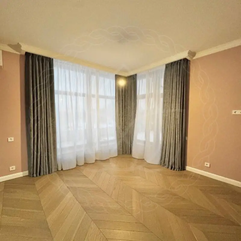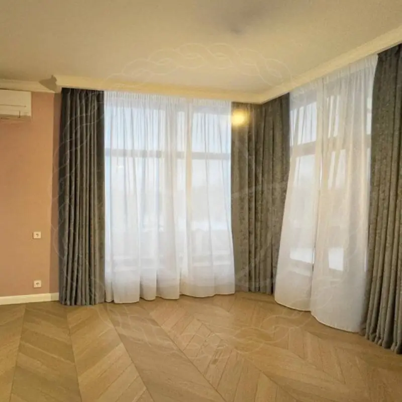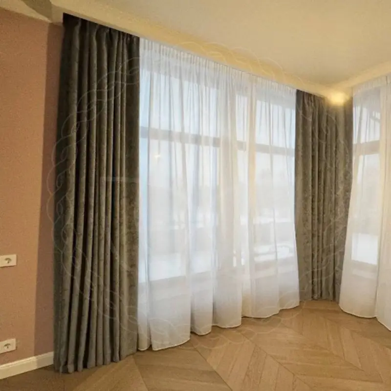 На пошив мы подбирали полиэстеровые ткани из категории “стандарт” и “премиум”. Портьеры навесили на профильный карниз с двумя рядами. Их размеры составили 390х300 сантиметров.
