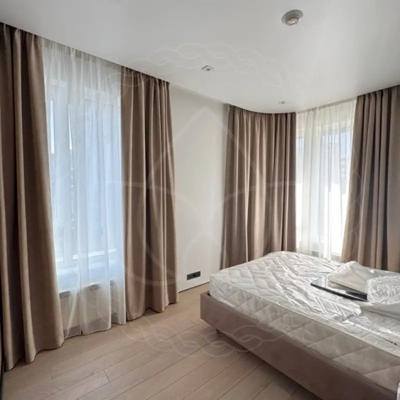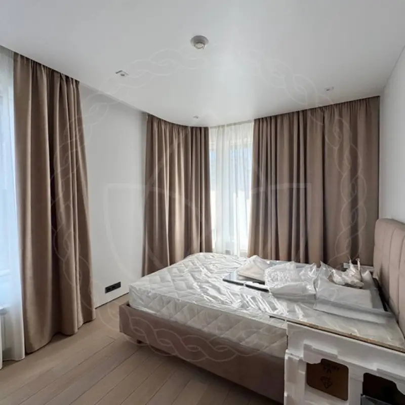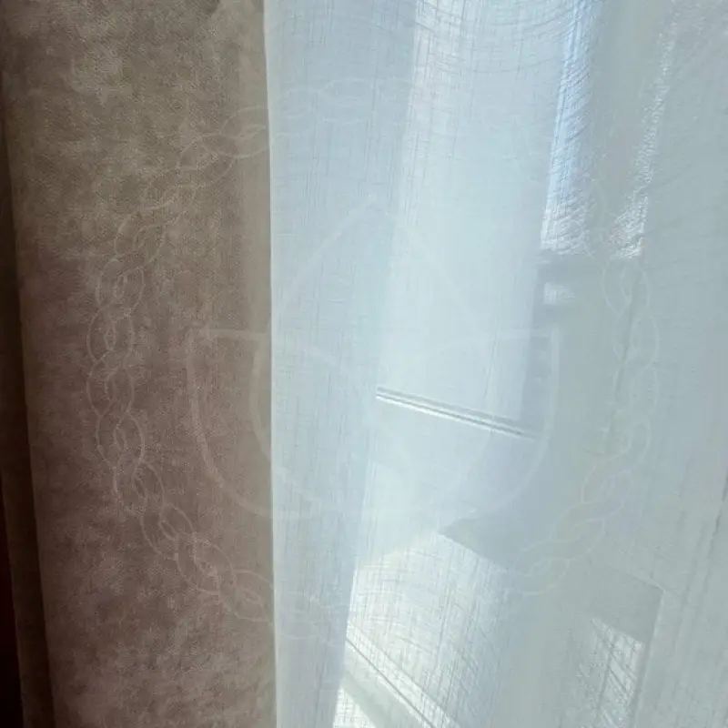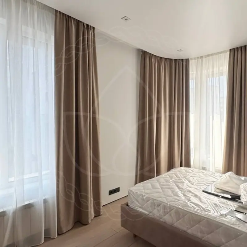 Для пошива были использованы ткани из стопроцентного прочного полиэстера категории “стандарт”. Шторные полотна размером 280х270 сантиметров навесили на потолочный профильный карниз. Шитье, монтаж и навеску проводили сотрудники нашей студии.