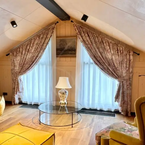 Гостиная в загородном доме хозяев большая, с нестандартными скошенными окошками. К ним идеально подошли портьеры с тюлем.