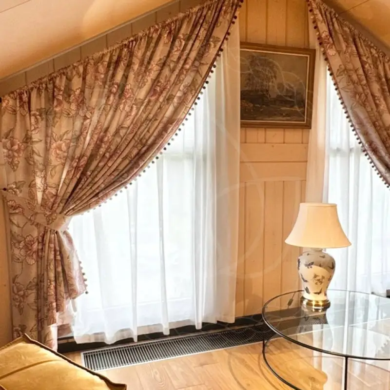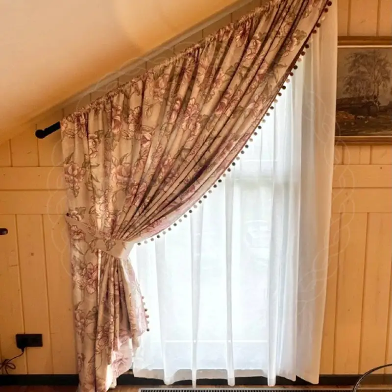 Плотные шторы с печатным принтом в виде крупных ярких цветков и тюлевая занавеска со льняной фактурой великолепно смотрятся на фоне стен, отделанных деревянными панелями. Симпатичный кант с маленькими помпонами, который мы пустили по внутреннему краю портьер, придает им более игривый и изящный вид, помогает создать приятную атмосферу домашнего уюта и комфорта.