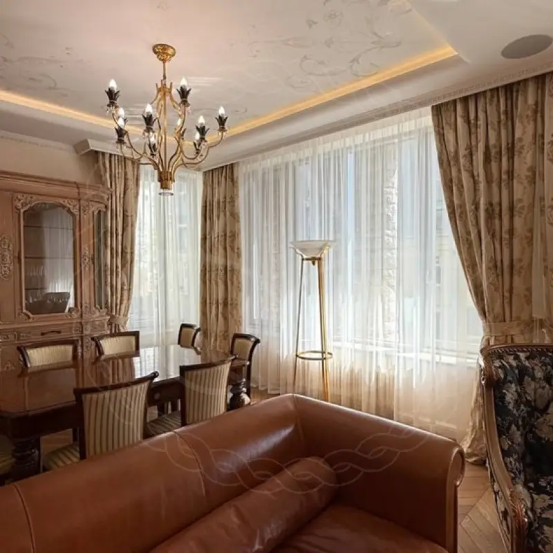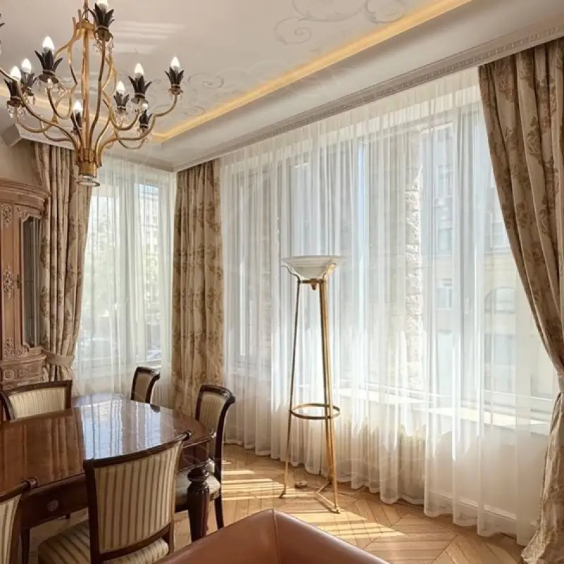 Гостиная в классическом стиле объединена со столовой и выглядит довольно просторной. Окна здесь угловые и широкие, почти до пола. Для такого интерьера идеальным дополнением стали плотные шторы с узором и однотонный тюль. Флористический орнамент на шторных полотнах перекликается с цветочным рисунком на обивке кресел и пуфика, паттерном потолочного декора и дизайном люстры с плафонами в виде цветков. Теплый бежевый оттенок портьерной ткани гармонично сочетается с мебелью и отделкой, выдержанных в разнообразных оттенках коричневого. Дополняющая ее белоснежная тюлевая шторка деликатно разбавляет палитру зала, помогая избежать цветового однообразия.