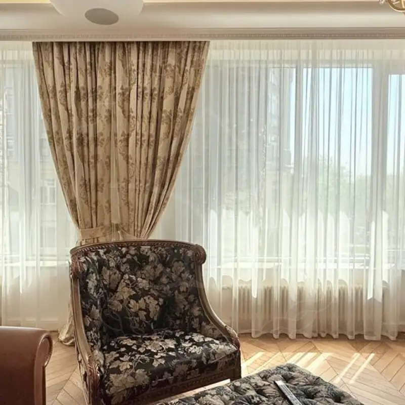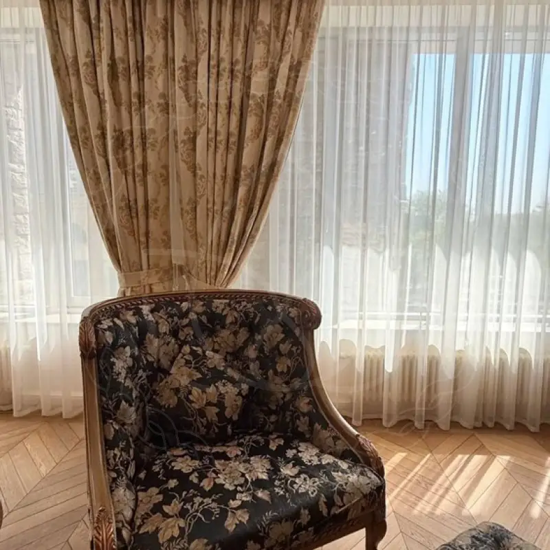 Для пошива были отобраны ткани класса “премиум” из стопроцентного высококачественного полиэстера (жаккард и сетка), не подверженного выгоранию и устойчивого к деформации. Размеры штор составили 400х280 сантиметров в ширину и длину. Под навеску были установлены профильные двухрядные карнизы.