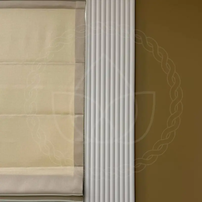 Для пошива выбрали портьерную ткань из стопроцентного полиэстера (рогожка) По размерам параметры получились следующими: ширина — 180, длина — 170 сантиметров. Под навеску нашим мастером был установлен классический подъемный карниз с цепочно-роторной системой управления.