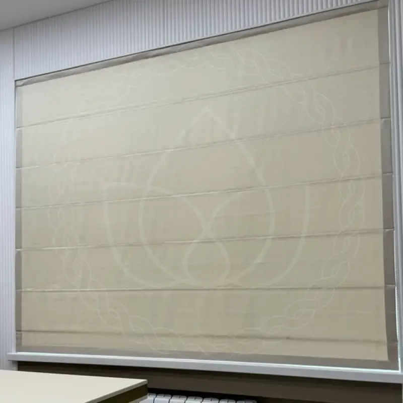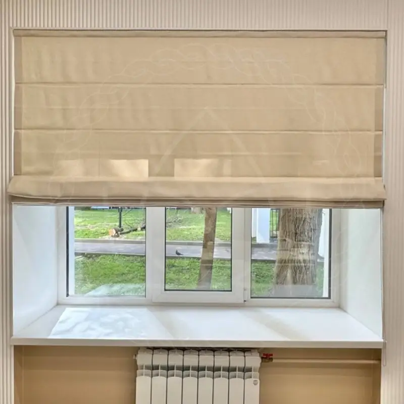 Шторное полотно однотонное и при подъеме собирается в ровные складки, оставляя подоконник свободным. Благодаря этому его можно использовать в качестве функционального пространства. В закрытом виде шторка прекрасно защищает от прямых солнечных лучей, которые зачастую создают блики на экранах рабочих компьютеров и перегревают офисное помещение в теплое время года.