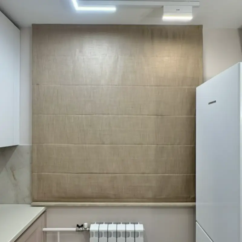 Портьеры крепятся на круглый карниз цвета шампань, а римская штора функционирует с помощью скрытого подъемного механизма.