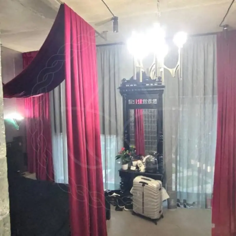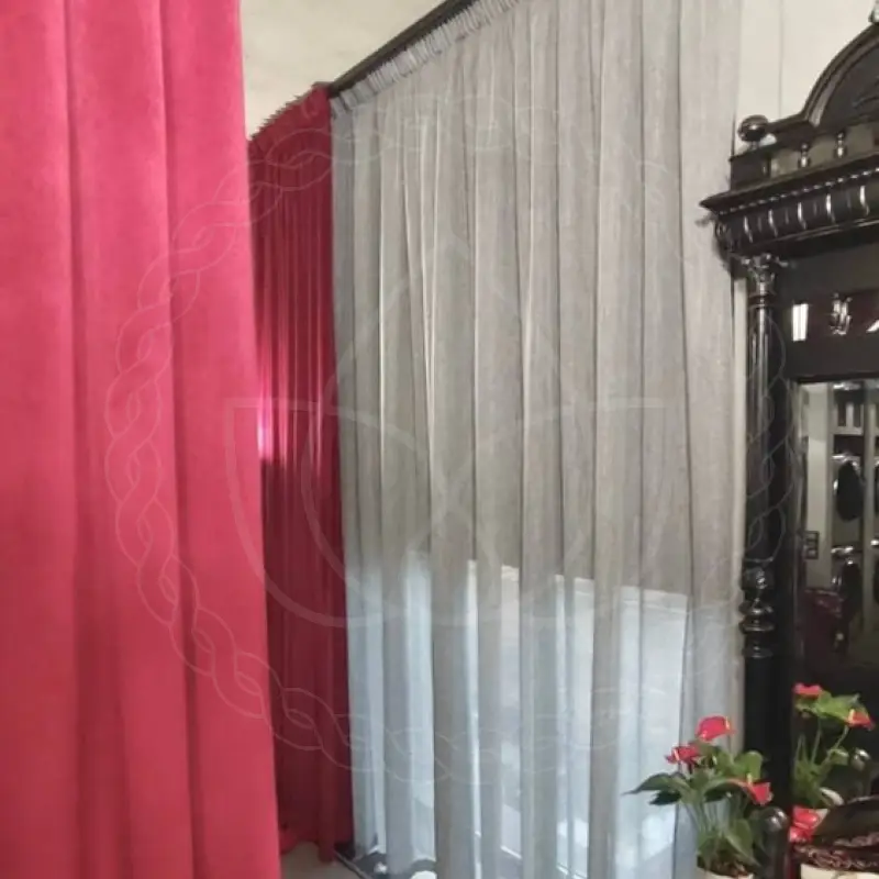Длина занавесей составляет 270 сантиметров, ширина — 340. Они были пошиты из стопроцентного полиэстера категории “премиум” Ткань отличается высокой прочностью и способностью держать форму драпировки. Под навеску использовали потолочный профильный карниз.