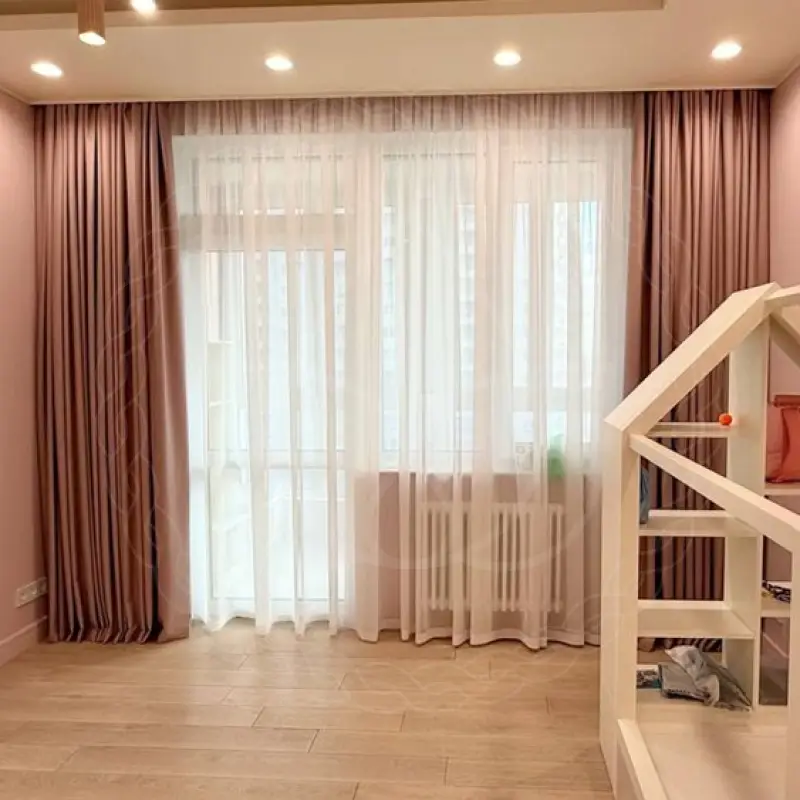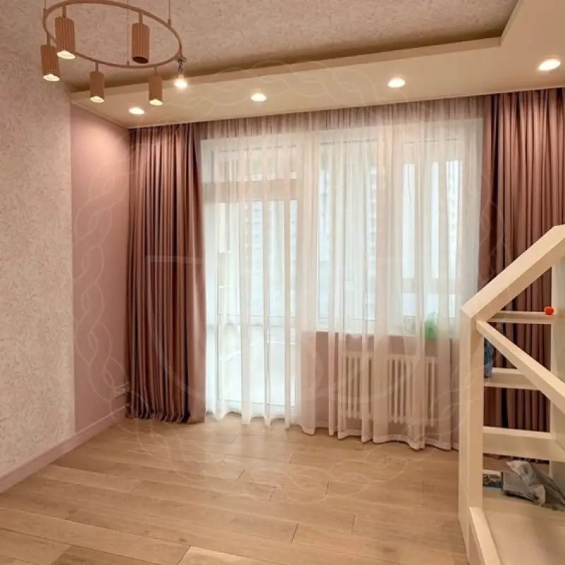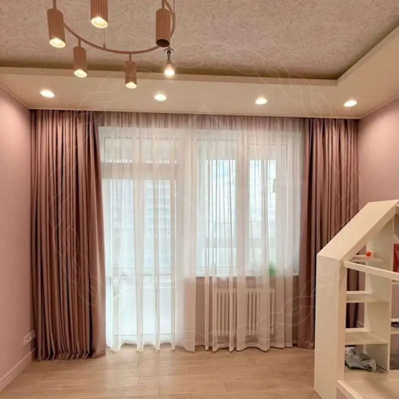 Для пошива использовались материалы из полиэстера категории “премиум” — тюль-креп и велюровая портьерная ткань. Нежная ворсистая поверхность велюра неизменно создает ощущение комфорта и уюта в любом помещении, а креповая материя хорошо рассеивает свет, обладает воздухопроницаемостью и прекрасно драпируется. Шторы по размеру имеют следующие параметры: длина — 280, ширина — 330 сантиметров. Под них в потолочную нишу наш мастер по монтажу установил карнизный профиль из алюминия с двумя рядами крючков.