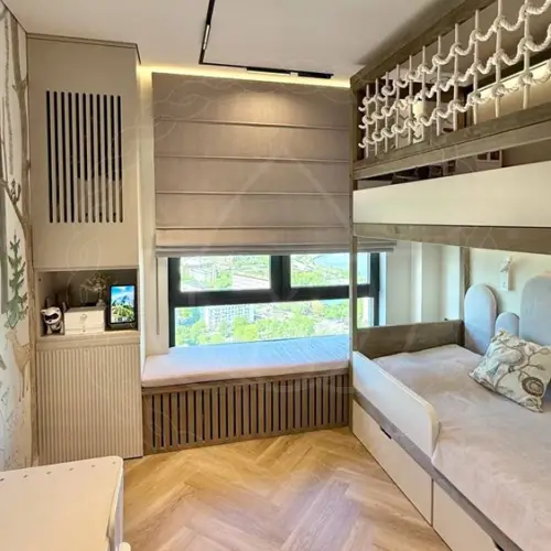 При пошиве к основному слою из рогожки мы добавили подкладку из блэкаута. Это помогает создать нужный для комфортного сна уровень затемнения в детской. Все использованные для изготовления материалы состоят из стопроцентного полиэстера. Размеры полотна в раскрытом виде составляют 170х180 сантиметров. Штору зафиксировали на подъемном карнизе с цепочкой для управления. Навеску и установку сделал мастер нашей студии текстильного декора.