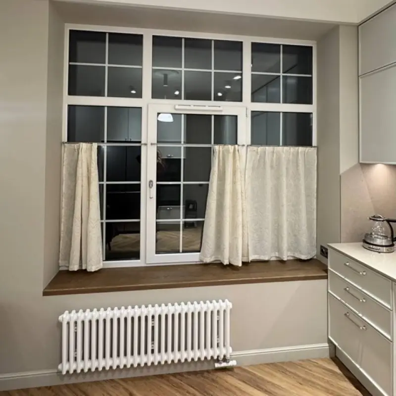 Украсить нужно было окна в кухне-гостиной, в декоре которой органично переплелись черты современного и классического стилей. Для этого мы предложили прямые портьеры, дополненные тюлем на ручной сборке.