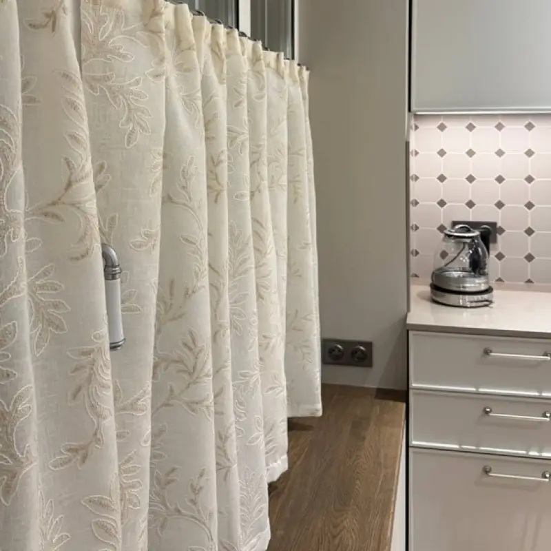 Портьеры и тюль были пошиты из стопроцентного полиэстера класса “премиум” и дополнены подхватами с мягкими кистями в тон ткани. Длина шторного полотна — 2.9 метра, ширина — 2.5. Навеску на круглый декоративный карниз проводил наш мастер.