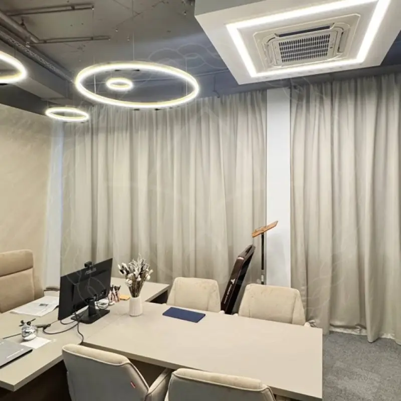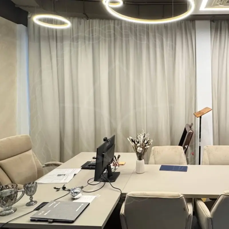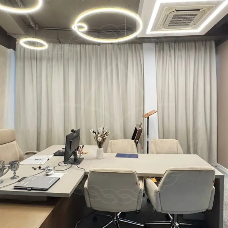 Шторные полотна пошили из ткани универсального цвета грейдж. Это смесь бежевого и серого. Они гармонично сочетаются с мебелью молочного оттенка и мягко подчеркивают ее и круглые люстры, становясь для них нейтральным фоном. Димаут надежно защищает помещение от перегрева и избытка солнечного света, вместе с равномерными складками на шторах создавая в нем комфортную для рабочих дел атмосферу.