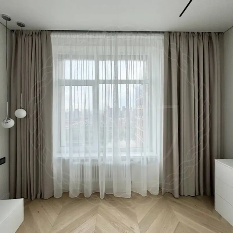 На пошив были отобраны полиэстеровые ткани категории “стандарт” — портьерная и тюлевая. Размеры готовых полотен в сантиметрах составил 320х280. Навеску, монтаж двухрядного карнизного профиля на потолочную зону и отпаривание штор проводили специалисты нашей студии.
