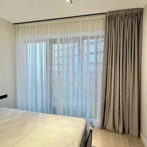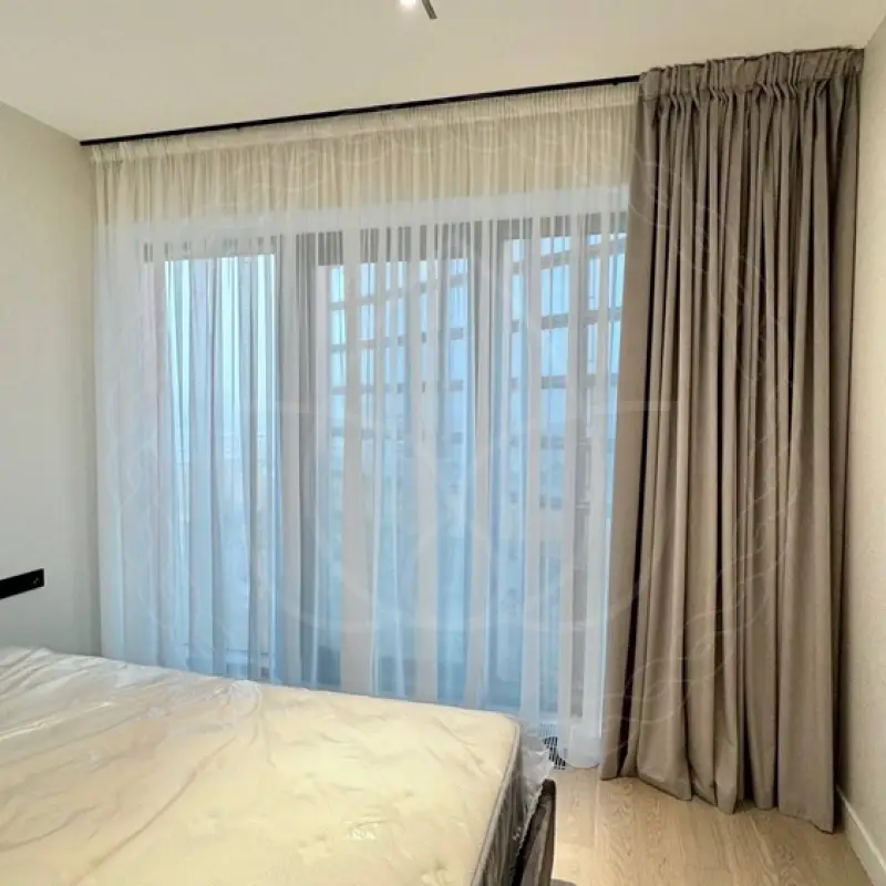 В рамках дизайн-проекта следовало декорировать большое панорамное окно в спальне. Комната обставлена и отделана довольно минималистично, поэтому перед оконной зоной много свободного места. Таким образом, сохраняется ощущение простора и прекрасный обзор с высокого этажа, где расположена квартира хозяев. Чтобы сохранить это, подчеркнуть окошко и заодно добавить уюта и приватности в атмосферу спальни, мы предложили для оформления традиционный дуэт из портьер с тюлем.