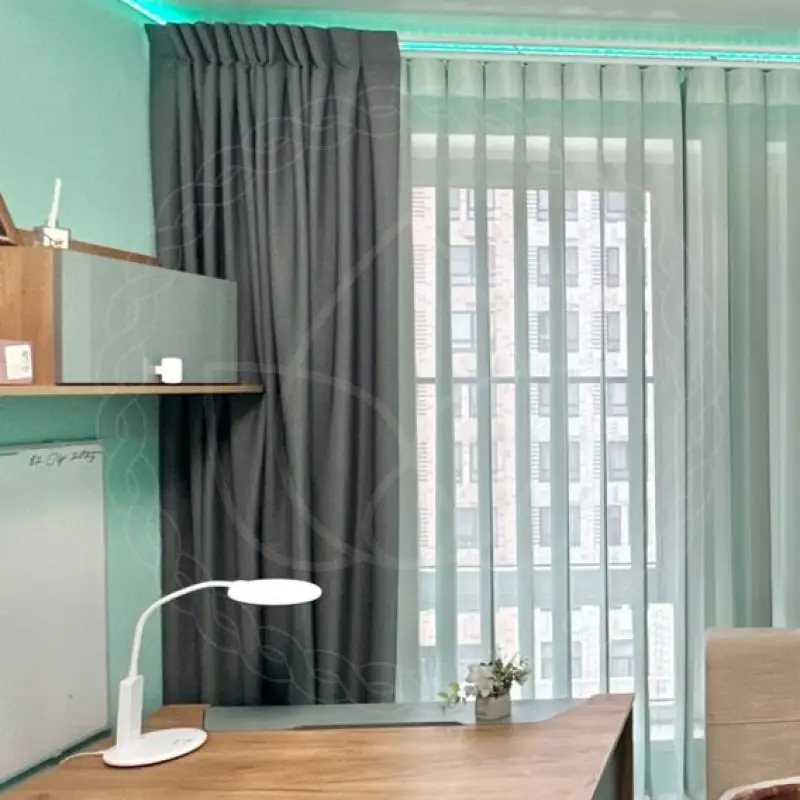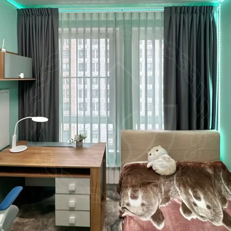 Плотные шторы сделали на равномерной сборке, а тюлевые собрали на складку “волна” с двойным коэффициентом сборки. Она придает драпировке объем и выглядит очень эффектно, одновременно зрительно расширяя пространство в узкой комнате и приподнимая потолок за счет вертикальных складок.